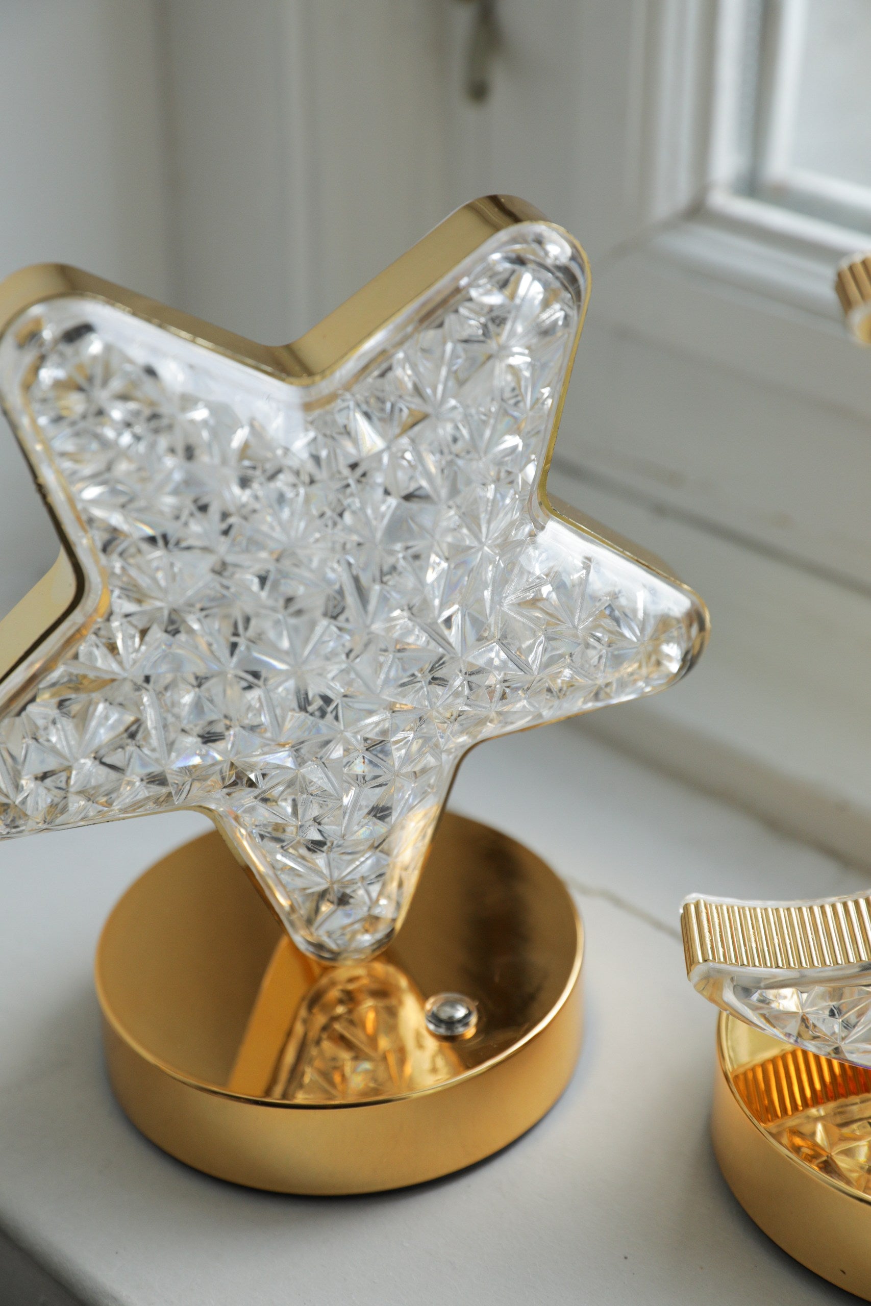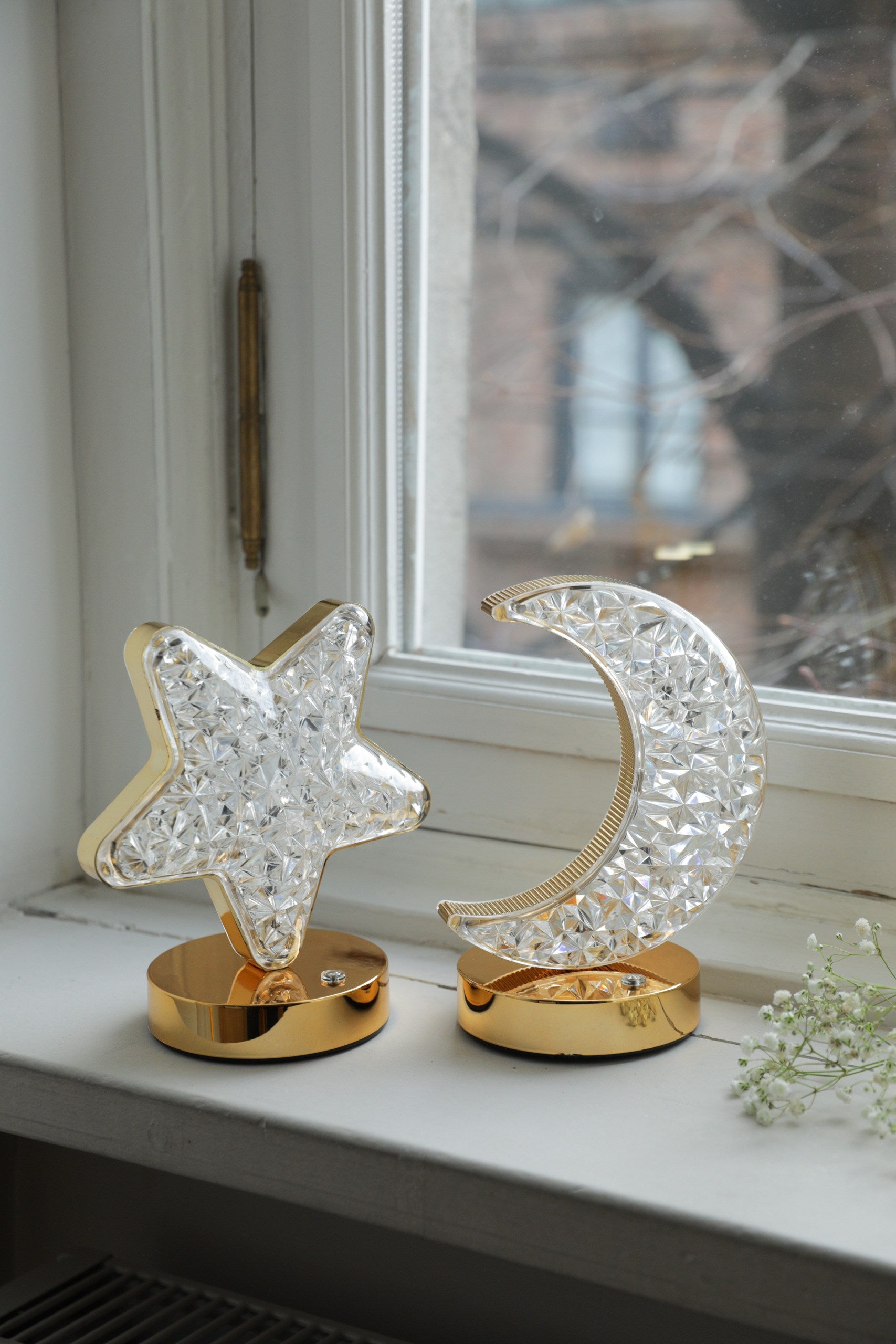 Set of 2 rechargeable battery lamps (Crescent and Star) made of plastic and metal, finished in gold accents. Suitable for table or decorative lighting.