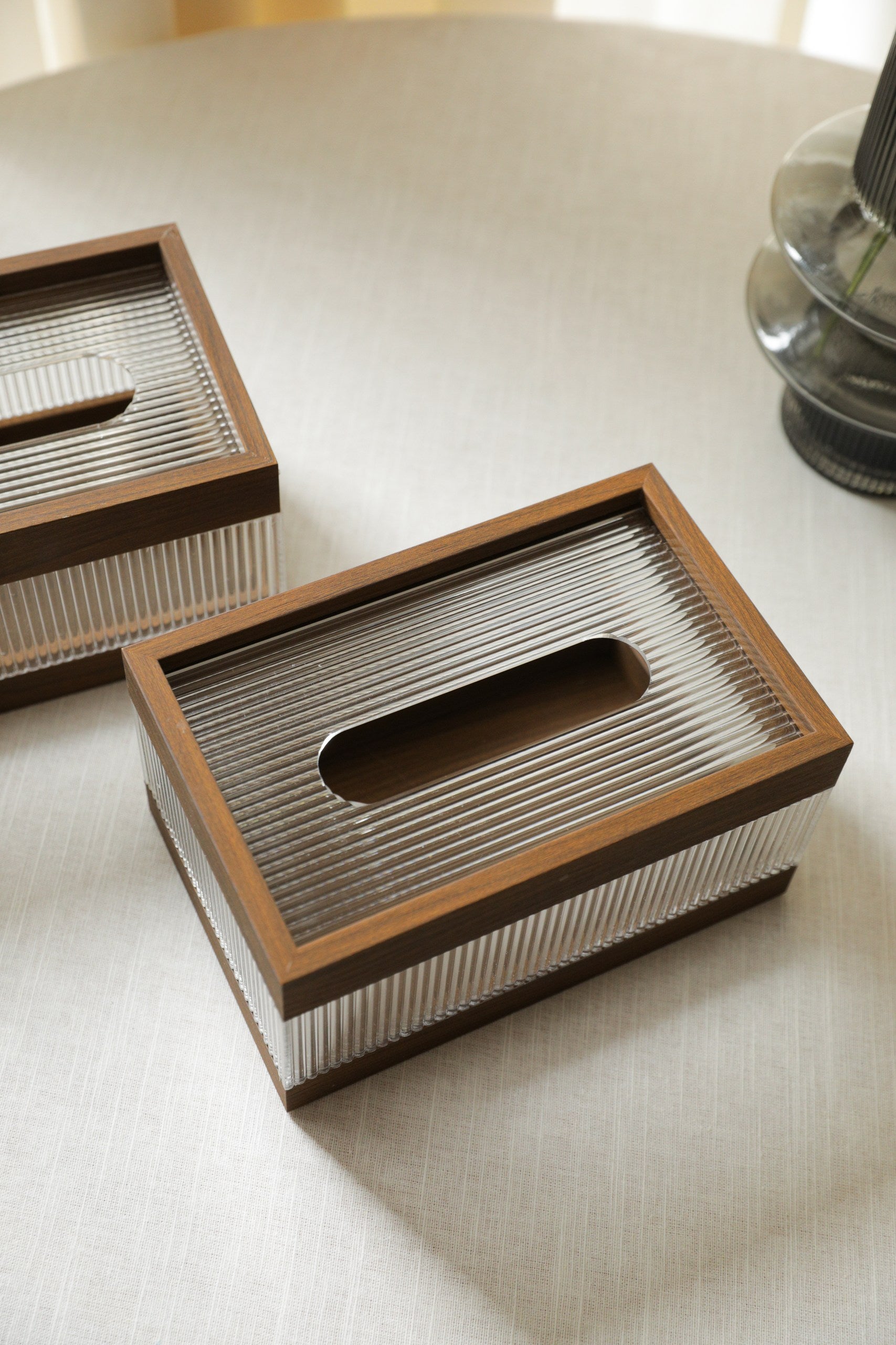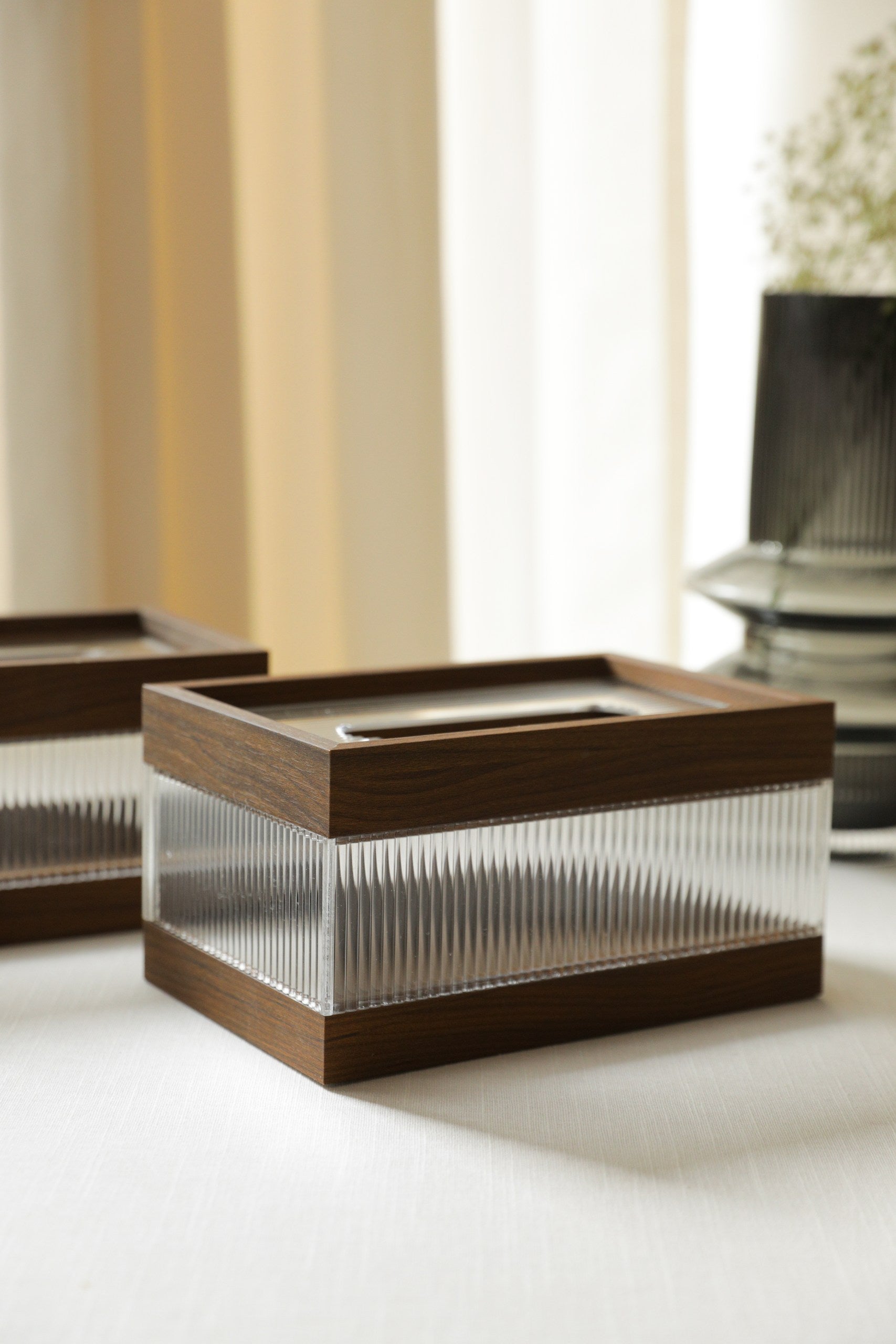 Set of 2 tissue box covers with a wooden frame, rippled acrylic sides and top.