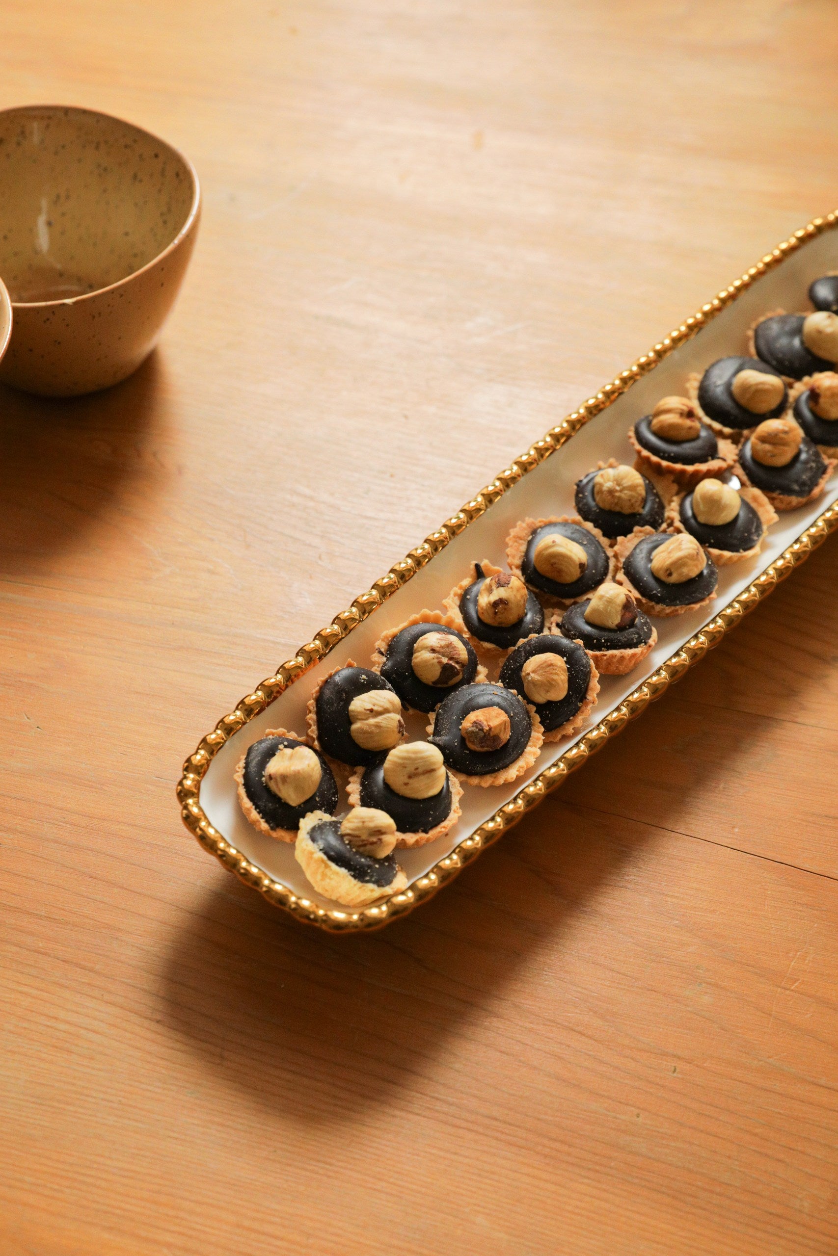 طبق تقديم مصنوع من السيراميك ذو شكل نحيف بأطراف خرز ذهبية، مناسب لتقديم المقبلات أو الحلويات أو الأطباق المشتركة.