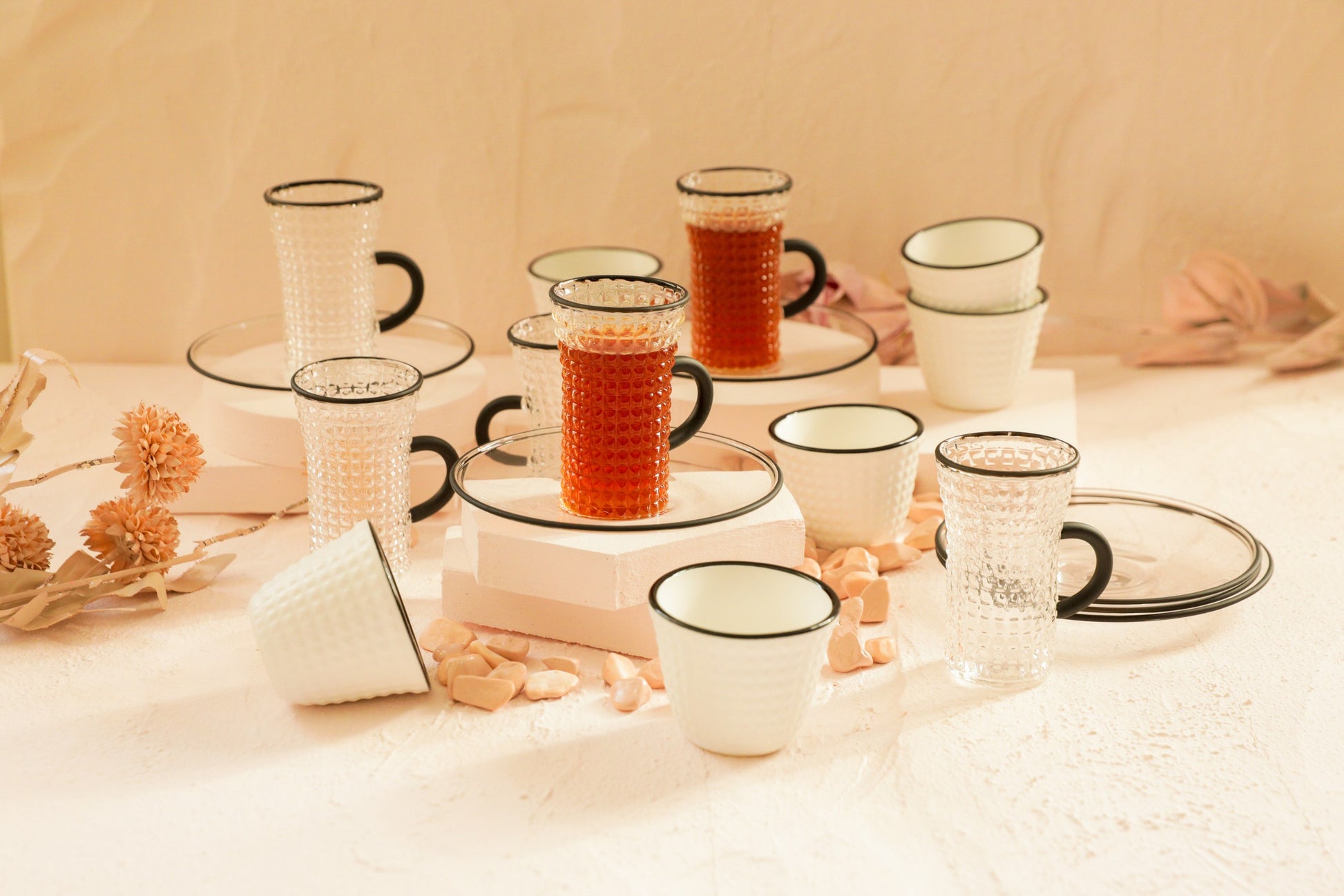 مجموعة من فناجين القهوة وأكواب الشاي النحيفة بتصميم راقٍ يتميّز بنقوش دقيقة ولمسة مستوحاة من تفاصيل وأناقة المجوهرات.