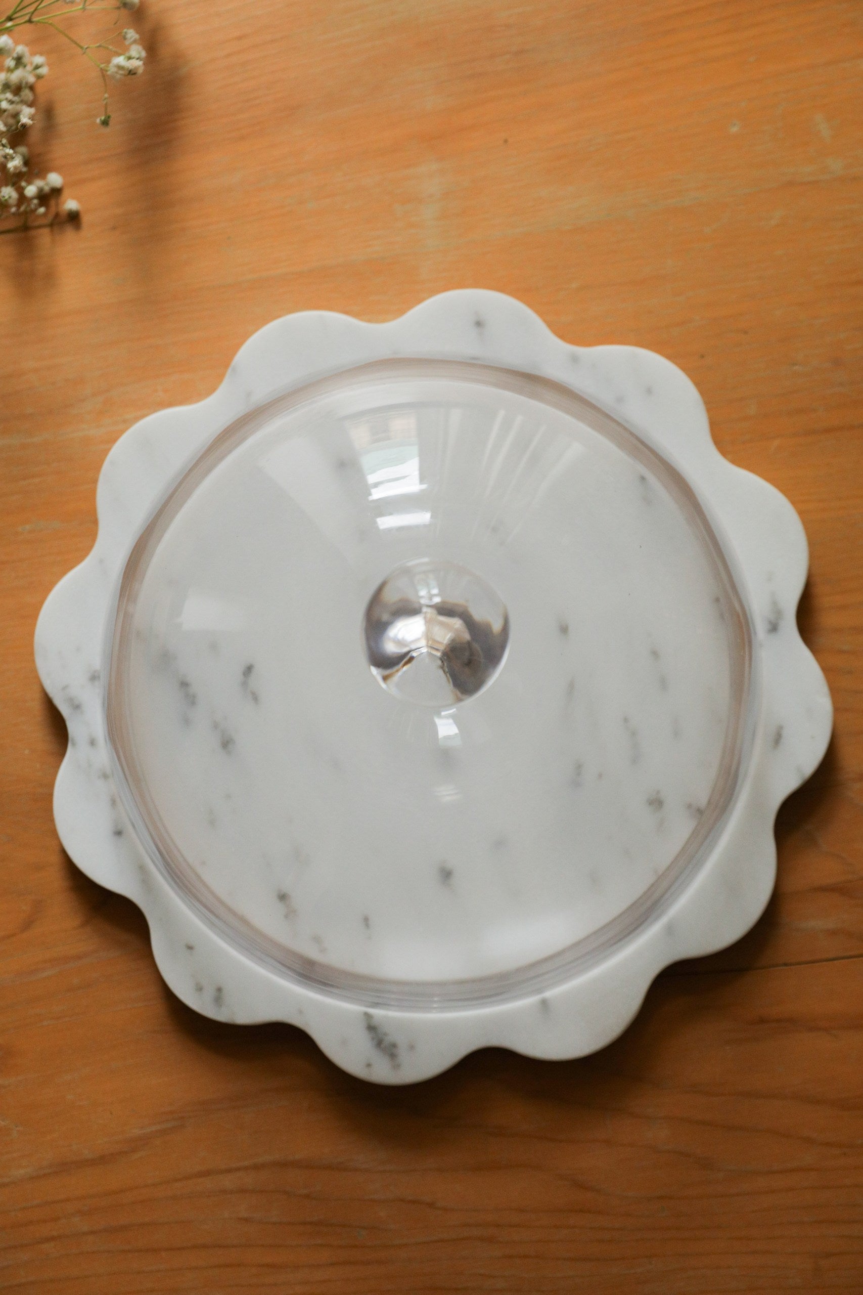 حامل كعك بقاعدة من الرخام وغطاء زجاجي.